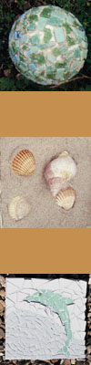 Es eignen sich verschiedenste Materialien zur Mosaikherstellung: Fundstücke, Muscheln, Porzellanscherben, Fliesenbruch,