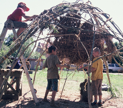 Mit Kindern des Ferienpasses wurde mit gebogenen Weidenstöcken eine große Rundhütte errichtet. Diese wurde dann mit einer Stroh-Lehm-Mischung bedeckt und danach mit Lehm verputzt.