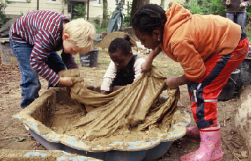 Materialien Lehm ( z.B. zum Bau von einem Lehmbackofen ), Holz ( z.B. zum Bau von einem Holzschiff ) und Weide sowie mit den